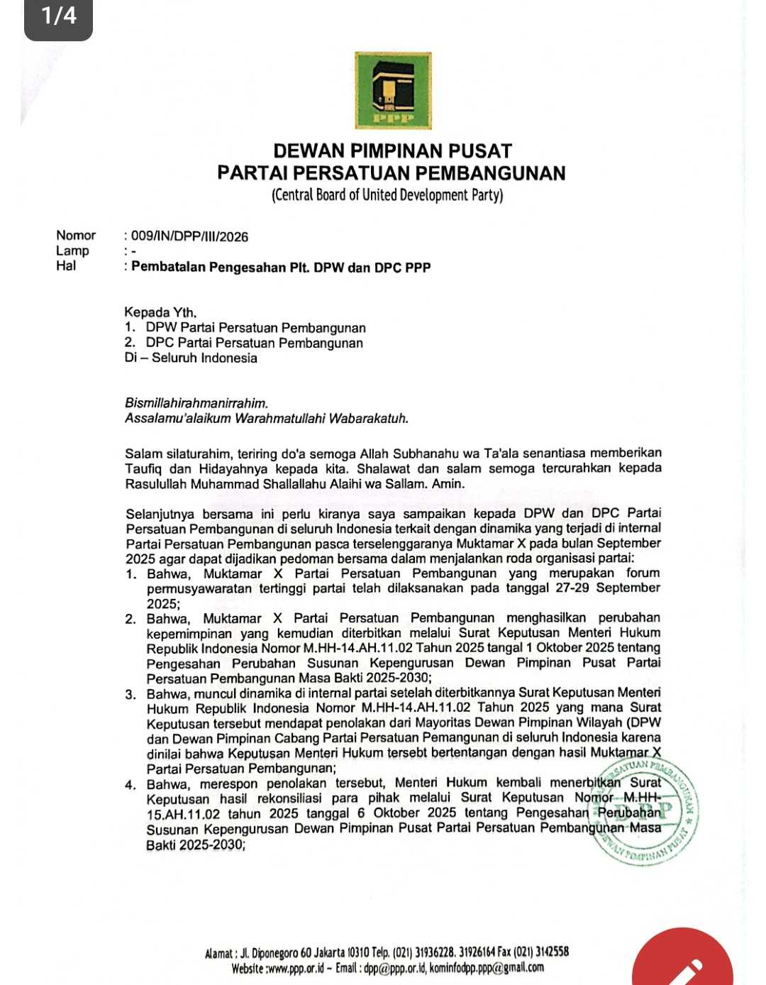 - Poin l, Surat Keputusan DPP PPP nomor 0056/SK/DPP/W/II/2026 tanggal 06 Februari 2026 tentang Penetapan Plt Ketua, Sekertaris, dan Bendahara Dewan Pimpinan Wilayah Partai Persatuan Pembangunan Provinsi Maluku Masa Bakti 2021-2026.